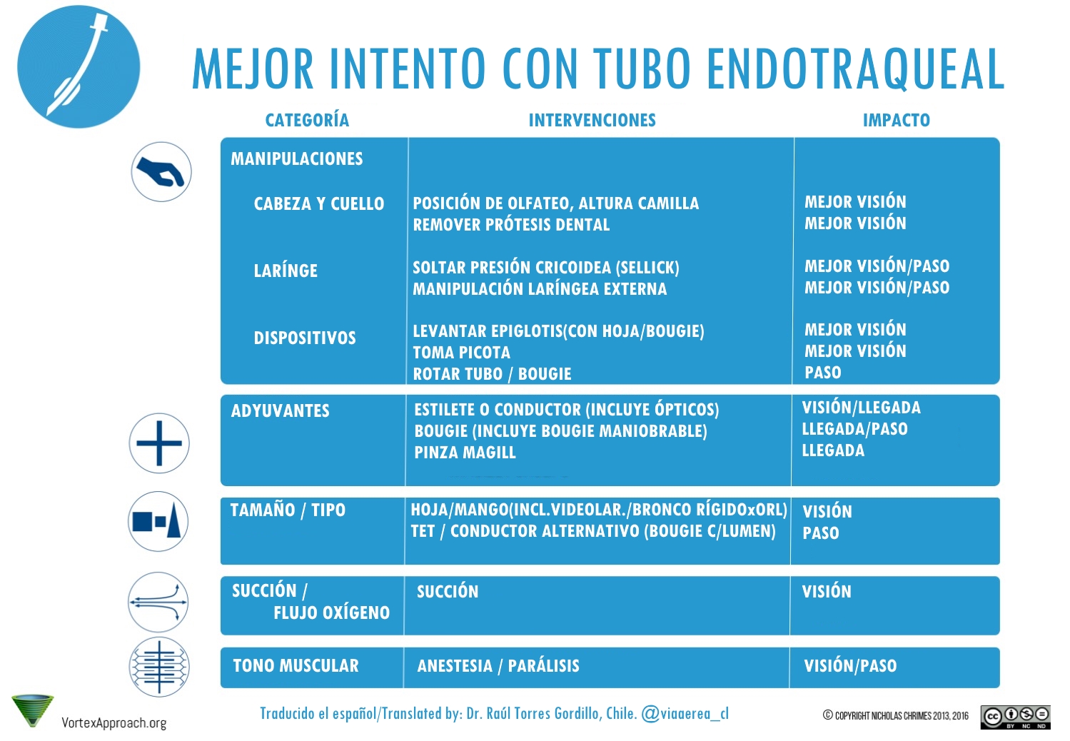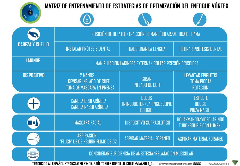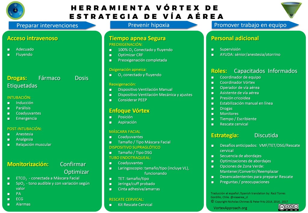 El Enfoque o Abordaje Vórtex (www.vortexapproach.org), creado por Nicholas Chrimes (anestesiólogo) y Peter Fritz (urgenciólogo), es un nuevo método de enfrentar el manejo de la vía aérea. No reemplaza los algoritmos convencionales, es un complemento a ellos. Esta serie de herramientas cognitivas están diseñadas para ser usadas antes y durante la intubación, ayudándonos a la planificación de una estrategia efectiva, segura y a ejecutarla correctamente.